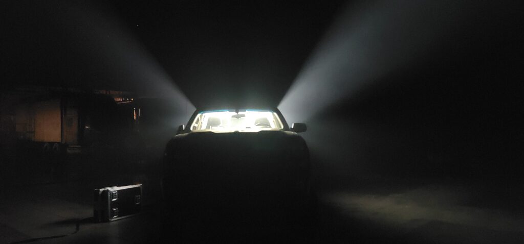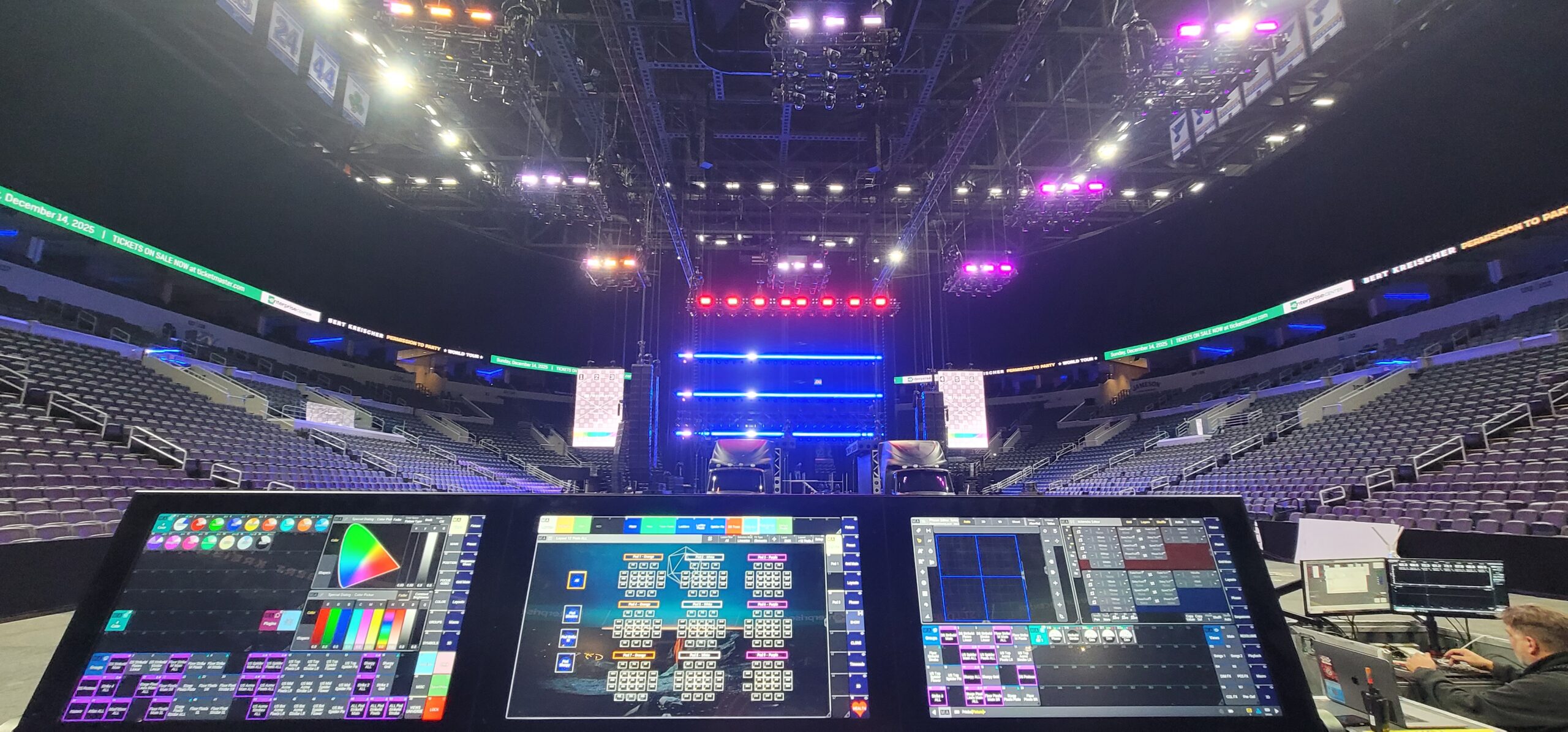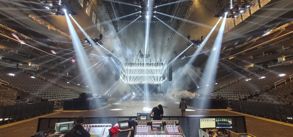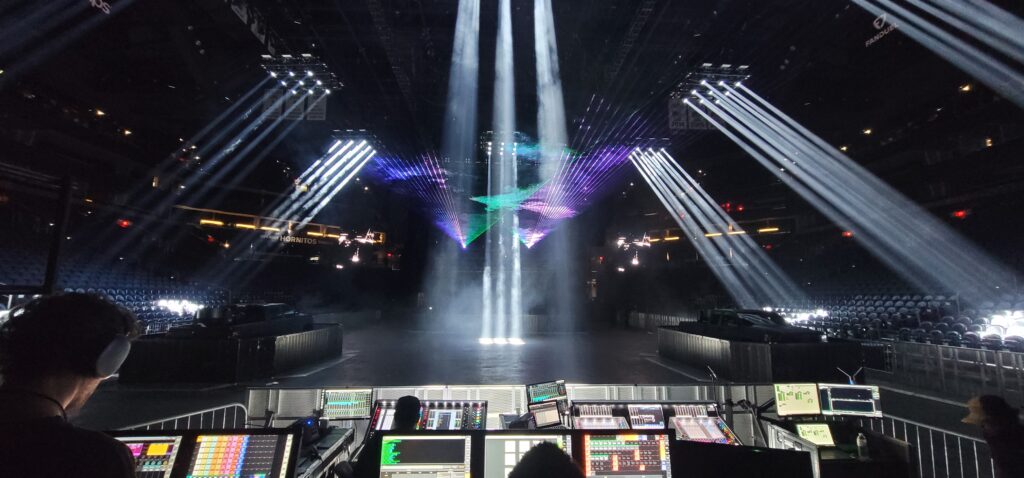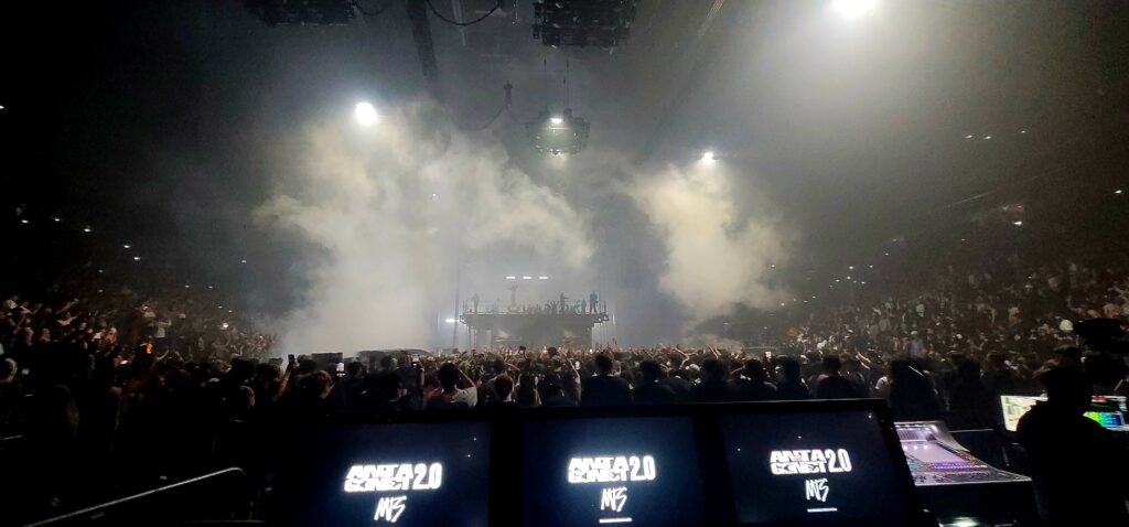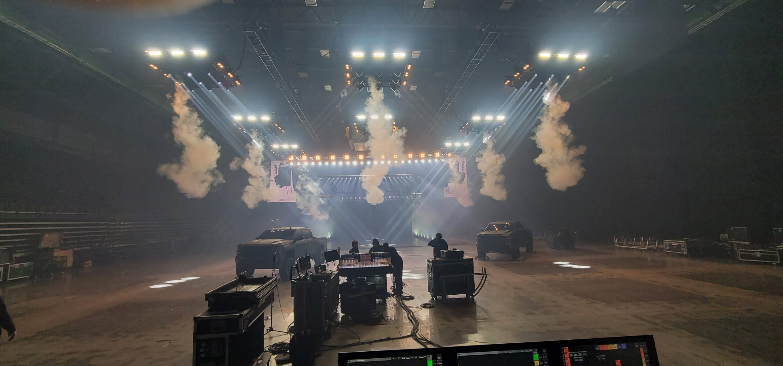 Being on the production side meant living in the trenches of load-ins, tech rehearsals, and the nightly resets. The stage design was massive and dystopian—two semi-trucks positioned front-stage with beaming headlights cutting through thick fog, creating an apocalyptic vibe like vehicles abandoned in a post-rave wasteland. Elevated platforms allowed the crew and Carti to prowl above the crowd, while moving elements (like platforms inching closer) amplified the sense of impending riot. We used heavy haze machines, cryo blasts, pyro, and flames on select tracks, all punted to the pounding 808s and distorted bass that define Carti’s sound. The lighting rig was brutal: relentless white pixels washing the arena, sharp white strobes firing in rapid bursts to disorient and energize, blackouts for dramatic reveals, and Ultimo Sharpys slicing through smoke. It felt less like a concert and more like stepping into an alternate reality—gothic, aggressive, and unapologetically chaotic.