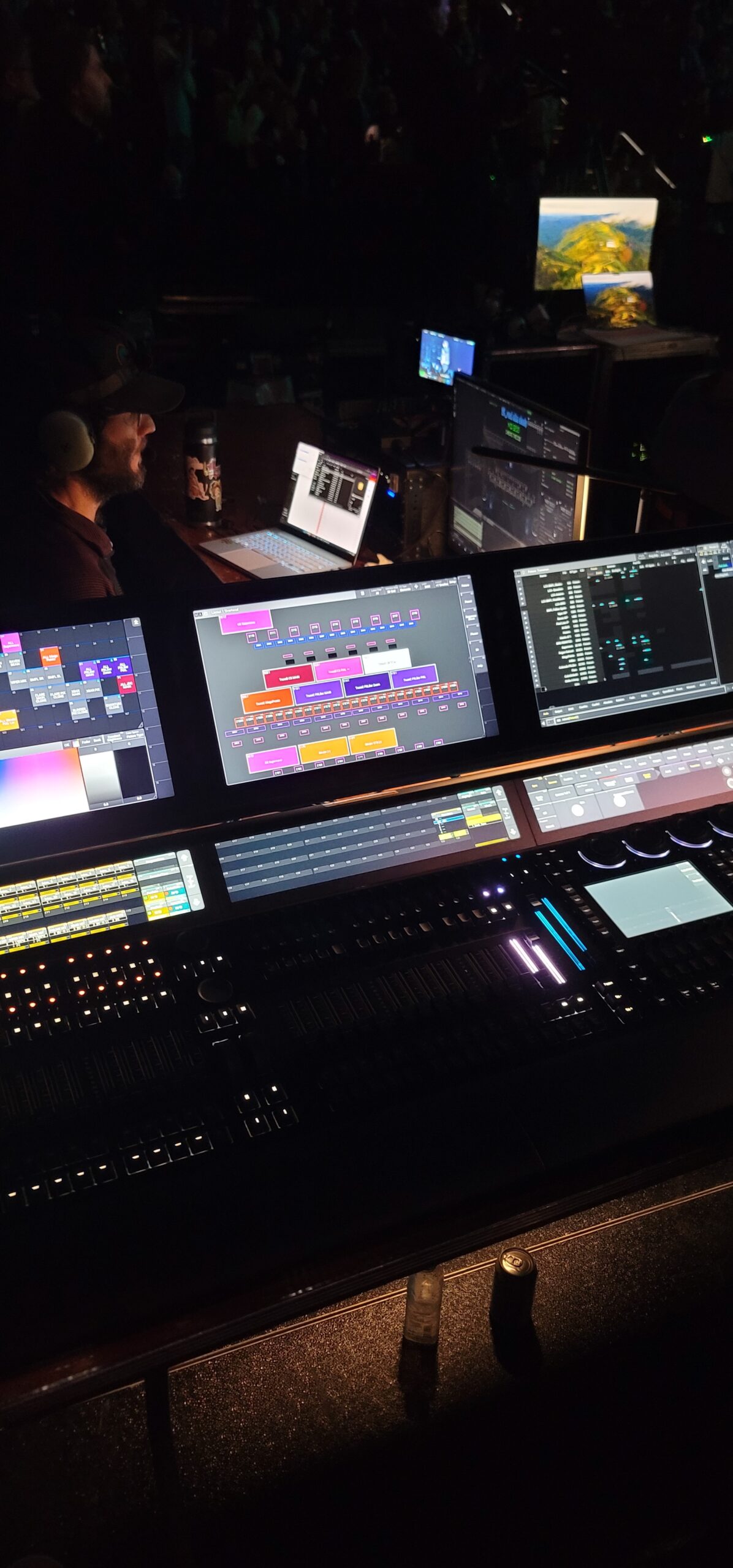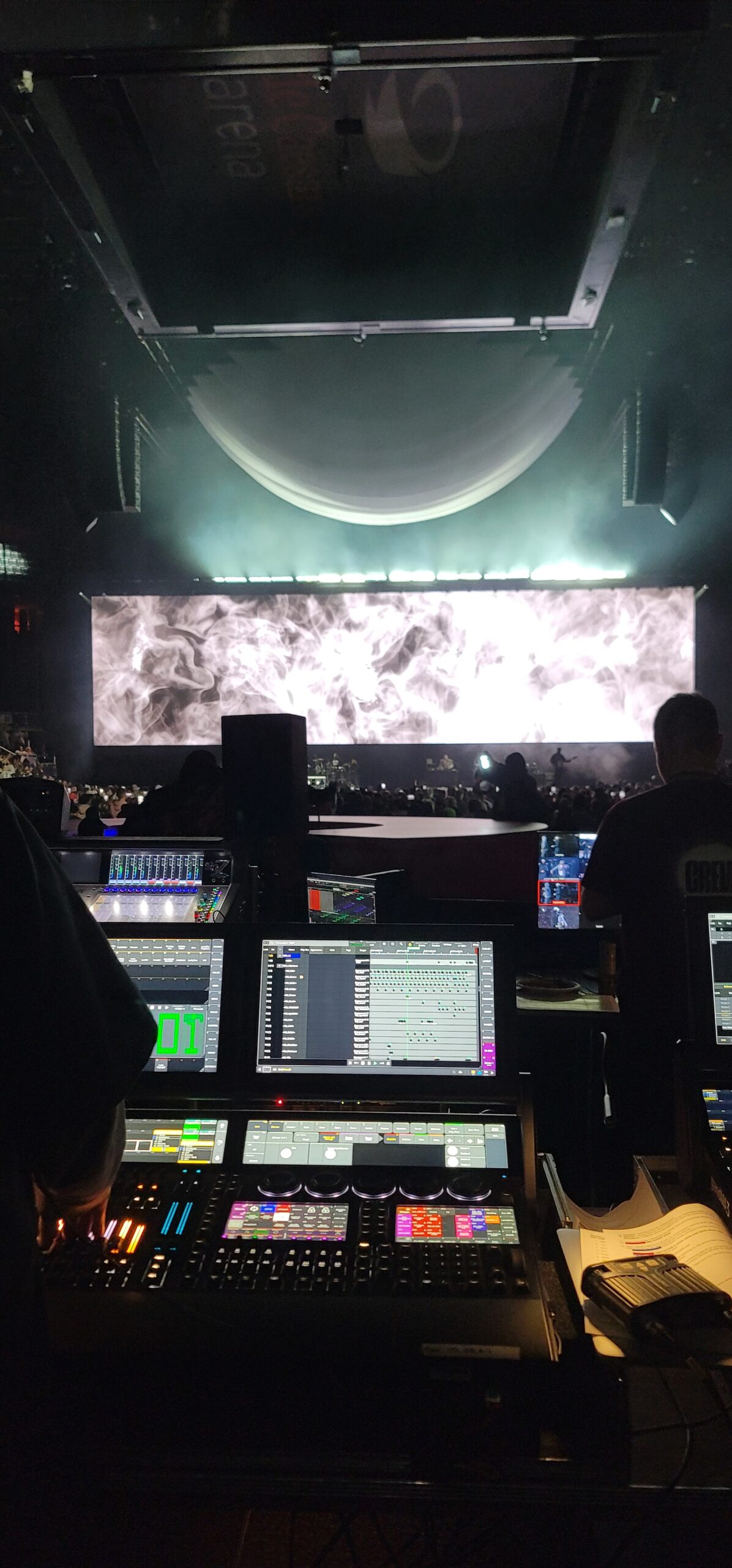 After we had finished setting up the rig, Dan (Em’s LD along with The Voice) came in to update his recipes and clone in his file. They kicked everyone out of the building beforehand–all production, hands, employees, hell, even the custodians and engineering. They did catch one employee recording the sound check/rehearsal and they actually got fired. Wild